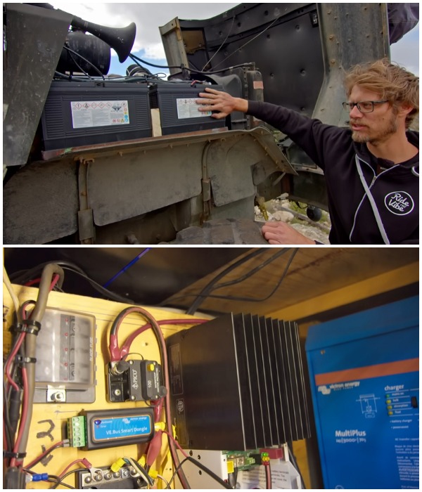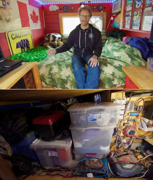 Всю заднюю часть своеобразного кемпера занимает спальня, ограниченная двуспальной кроватью и вместительным подиумом, в котором наряду с личными вещами и постельными принадлежностями, находится необходимое оборудование и инструменты. Пространство, где расположена электрическая система автономного обеспечения, включая инвертор/зарядное устройство мощностью 3 тыс. Вт, батареи емкостью 650 Ач и контроллер заряда солнечной батареи, подключенный к солнечным панелям мощностью 1,2 тыс. Вт (установлены на крыше дома), энтузиаст называет «захламленным гаражом».