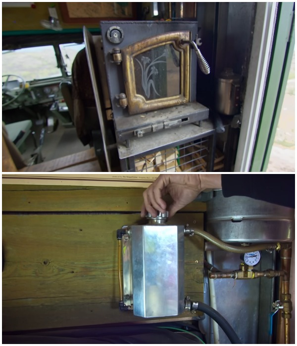 Хотя он не стал экономить на обогреве, кондиционировании и вентиляции воздуха. Майк разработал поистине уникальную систему отопления, собственноручно собрав дровяную печь так, чтобы она поддерживала комфортную температуру и нагревала воду в бойлере. При этом незаурядный экспериментатор умудрился изготовить систему подогрева воды в летний период. С помощью теплообменника тепло двигателя рециркулируется и рекуперируется, нагревая воду, которую можно использовать для питья или купания. А вот в зимнюю пору эта система, подключенная к плите, нагревает антифриз, что помогает завести грузовик при минус 40 за бортом. В продолжение темы предлагаем заглянуть в сказочный грузовой фургон, преобразованием которого занимался не менее креативный британец.