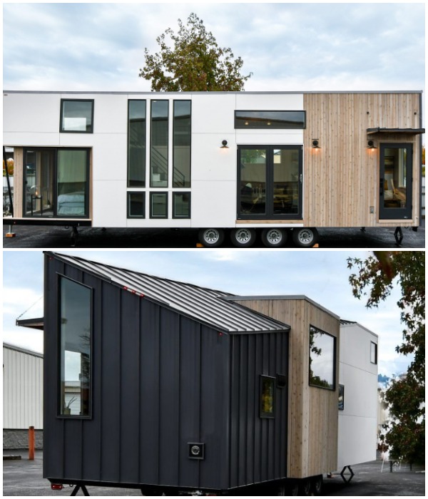 В экстерьере гармонично сочетаются белый цвет, натуральное дерево и черные стальные элементы. | Фото: tinyhousetalk.com.