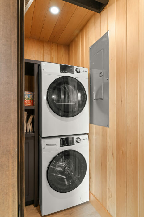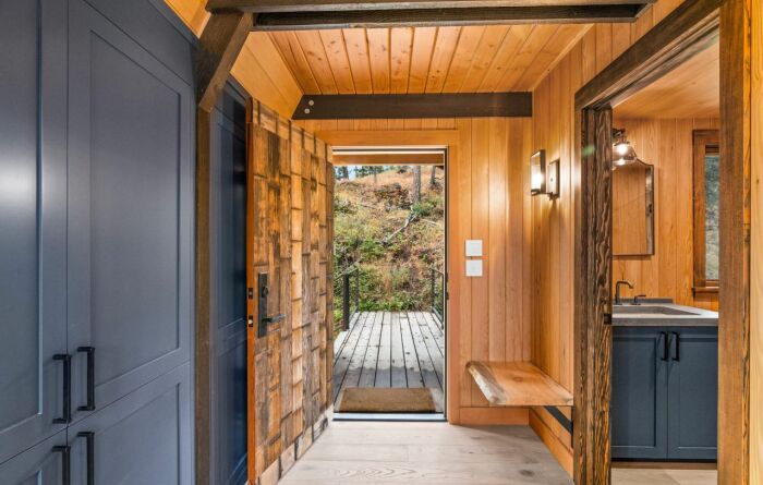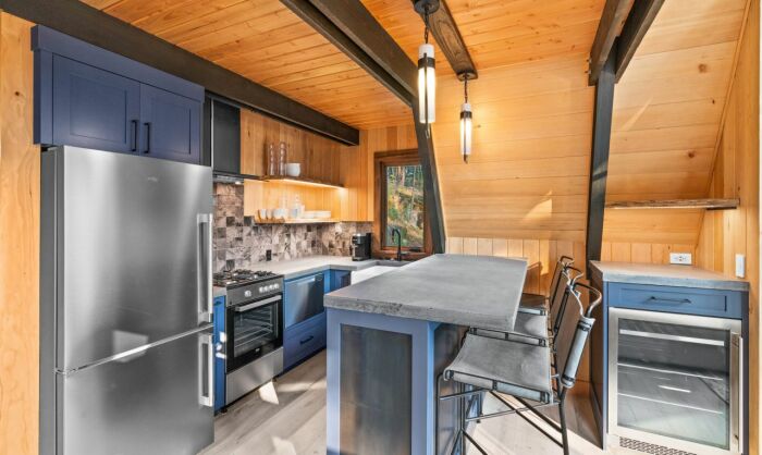 Оказавшись внутри домика, попадешь сразу на кухню, которая может похвастаться обилием деревянной отделки, масштабным окном, мебельным гарнитуром, сделанным на заказ, бетонными столешницами, обилием нержавеющей стали и современной бытовой техникой. Рядом находится обеденная зона, где можно вкусно поесть в располагающей атмосфере. А вот основная столовая находится у панорамного окна, что делает ее больше смотровой площадкой, отвлекающей от гастрономических изысков.