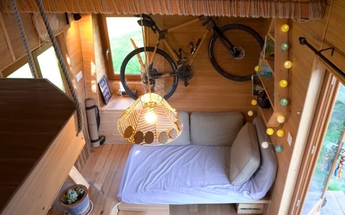 На страницах Novate.ru можно встретить множество вдохновляющих идей обустройства микродомиков, но этот заслуживает особого внимания. Стоит сразу отметить, что эта модель полностью ориентирована на устойчивость и экологичность, без использования каких бы там ни было синтетических материалов, пусть и максимально безопасных, практичных и эстетически привлекательных. Также при сборке и отделке структуры дома/мебели не использовались ни клей, ни краска, ни лак. Именно это обстоятельство и привлекло будущего домовладельца, который мечтал только об экологически чистом доме, построенном из натурального дерева.