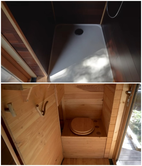 Несмотря на более чем крошечные размеры, в мобильном доме имеется вполне благоустроенный санузел, состоящий из душевой кабины и туалета с функцией компостирования. Он предусмотрительно изолирован от жилого пространства и находится у торцевой стороны, где имеется стеклянная дверь, которая дает возможность любоваться природой во время водных процедур и проветривать пространство после приема душа.