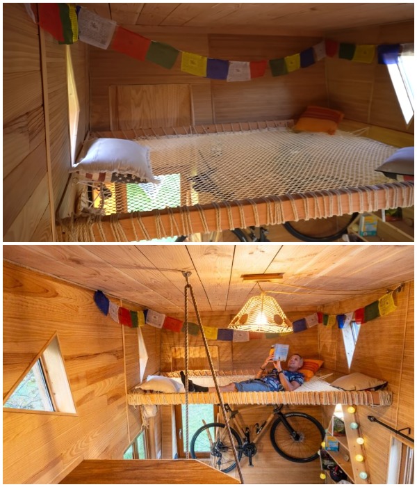 Зона сна находится на «антресоли», поддерживаемой конструкцией душевой кабины и толстой веревки, закрепленной на крюке, вкрученном в потолок, что само по себе является неожиданным внедрением. Попасть на второй уровень можно по лестнице, установленной на край кухонного стола. Здесь обустроено просторное спальное место, рассчитанное на двух человек. В этой зоне также имеется несколько окон, одно из которых дает возможность более качественно проветривать весь домик, впускает свежий воздух и свет, а также открывает прекрасные виды небо и на кроны деревьев.