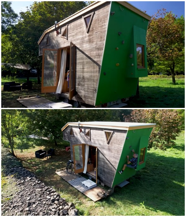 Но и это еще не все возможности крохи. Наклонная стена используется как скалодром, позволяющий взобраться на крышу, где запросто можно устроить посиделки, расслабиться под звездным небом. Хотя для отдыха имеются и другие места на участке, позволяющем организовать и зону барбекю, и костер, и сон в гамаке, там же можно пристроиться и с ноутбуком, чтобы поработать. Не менее впечатляет и модель Microhaus, которую разработал украинский стартап, правда, выглядит он более современно и напичкан множеством «умных» систем.