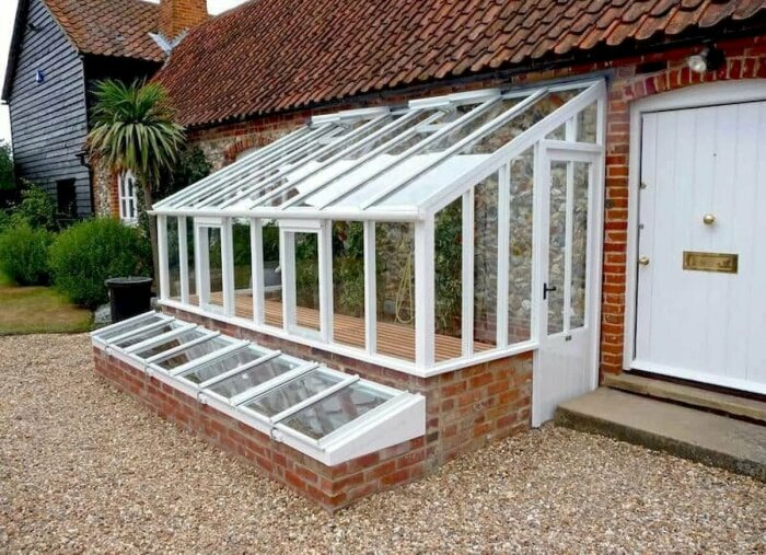 Односкатная - характеризуется пристройкой к стене основного дома с южной стороны, образуя односкатную конструкцию. Основным преимуществом является наличие одной уже готовой стены, что снижает затраты на материалы и экономит пространство. Благодаря такой конструкции обеспечивается защита от ветра с одной стороны, а также близкий доступ к электричеству и водоснабжению.