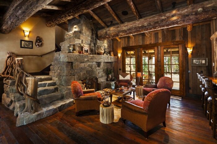 Шале — это стиль, который привносит в помещение атмосферу горных таунхаусов. Особенности шале включают использование натуральных материалов, таких как дерево и камень, а также элементы декора в виде оленьих рогов или шкур, чтобы создать атмосферу уединения в горах.