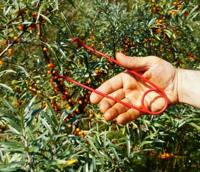 При сборе облепихи часто возникают сложности из-за того, что ягоды крепко держатся на ветках, образуя густое скопление. Ручной сбор занимает много времени и труда. Для того, чтобы собирать ягоды без травмирования себя и повреждения облепихи придумано специальное устройство, снабженное острыми лезвиями. Этот гаджет является необходимым помощником для собора ягод с кустов и использования их в кулинарии.