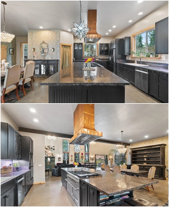 А вот часть столовой располагает к шумным вечеринкам в большой компании, ведь мало найдется семейных домов, имеющих практически настоящий бар и огромный обеденный стол. Приготовить званый ужин также получится, поскольку в доме есть огромнейшая кухня, которая может похвастаться стильным мебельным гарнитуром, основательными мраморными столешницами как в рабочей зоне, так и на кухонном острове, профессиональной варочной панелью с шестью конфорками и двойным духовым шкафом, глубокой мойкой прямо у окна, отдельным обеденным столом и откидной стойкой, являющейся продолжением острова. Здесь также установлен полноразмерный холодильник, посудомоечная машина, мощная вытяжка и современная бытовая техника, облегчающая и ускоряющая процесс самостоятельного приготовления пищи.