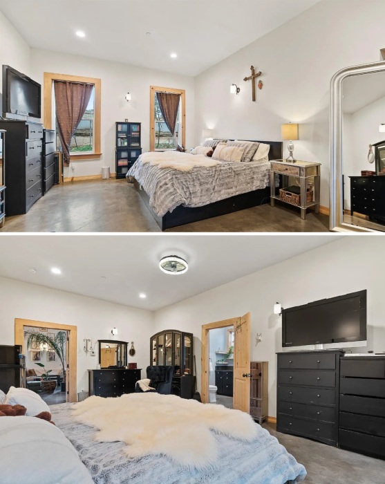 По факту же, на снимке можно увидеть лишь полузаброшенный металлический амбар, в облике которого только занавески на окнах намекают на то, что это все же жилое помещение, с «красующимся» перед ним пустырем. С первого взгляда сложно догадаться, за что просят такие деньжищи, ну разве что за участок земли в природной зоне. Недоумение развеивают снимки интерьера, которые никак не вяжутся с внешним видом загородной резиденции, построенную совсем недавно, в 2020 году.