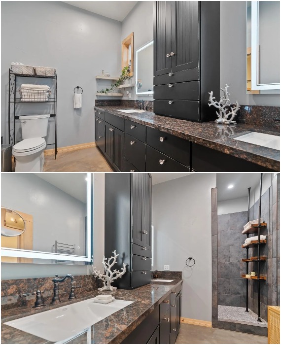 В дизайне интерьера сочетается несколько стилей и личные предпочтения владельцев. Как оказалось, столь непритязательный внешний вид в стиле сельского амбара, да еще и с вкраплениями ржавых элементов – это дизайнерский эксперимент владельцев, загоревшихся идеей строительства эклектичного дома, скрывающего за скромным фасадом современное богатство и роскошь. При этом они вдохновлялись не фермерскими хозяйственными постройками, а промышленной архитектурой шахты Empire, расположенной неподалеку. Отсюда и ржавые листы металла, и структура самого дома, предусматривающая высокие потолки и открытую планировку.