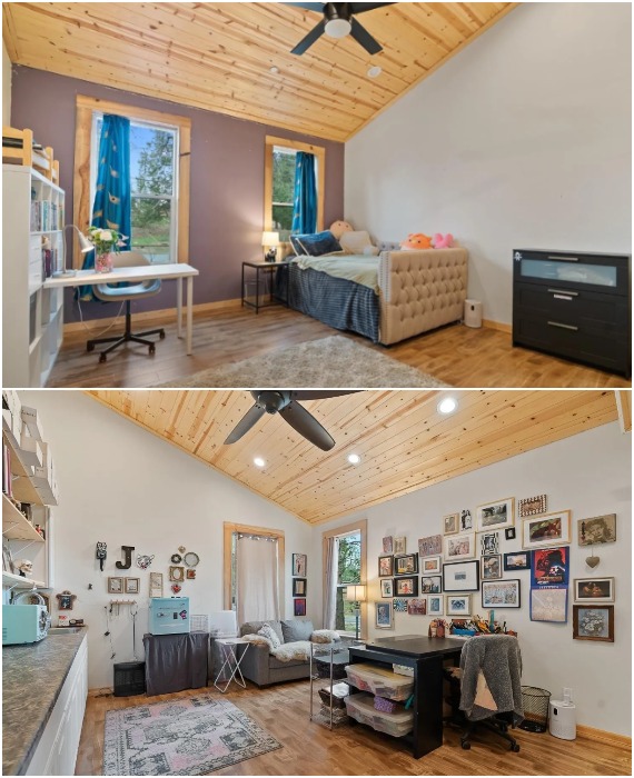 На втором уровне также имеется роскошная ванная комната. Она расположена между двумя спальнями, которые легко могут выступать как в роли детских, так и гостевых. Их интерьер более простой и по-домашнему уютный, здесь нет ни помпезности, ни вычурности. Скошенный потолок, подбитый натуральным деревом, идеально гармонирующий с такого же тона и фактуры пола, белоснежные стены с акцентными вкраплениями, наличие окон, из которых открывается прекрасный вид на лес и даже небо – все это создает умиротворяющую обстановку, очень подходящую для зон отдыха. При этом в одной из спальных комнат есть собственный кухонный уголок с рабочей/обеденной зоной, а в другой – гостиная и место для организации домашнего офиса.