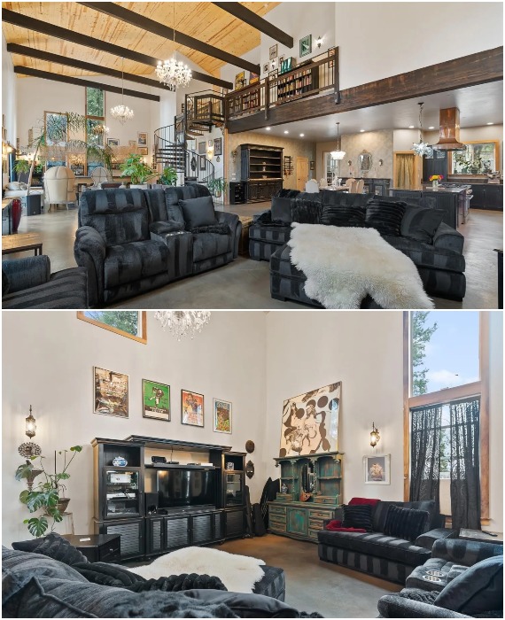 Если говорить о планировке необычной резиденции и об оформлении жилого пространства, то здесь действительно основное пространство не имеет ограничений ни в виде перегородок или глухих стен, ни потолков. Эклектичный интерьер гостиных, столовой и кухни сочетает в себе изысканность викторианской мебели и аксессуаров, массивные балки, оттеняющие деревянный потолок, колоритный козырек над барной стойкой, созданный из тростника, современную бытовую технику, изящную винтовую лестницу и полированный бетонный пол. Учитывая достаточно большую площадь, гостиные являются обособленными зонами, обеспечивающими более спокойный и размеренный отдых на любой вкус. Одна гостиная рассчитана на тесное общение в кругу единомышленников, в другой же – можно полностью расслабиться, почитать, посмотреть телевизор, удобно усевшись на мягких диванах или на шкуре дикого животного.
