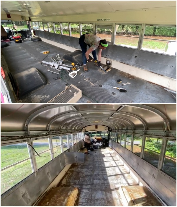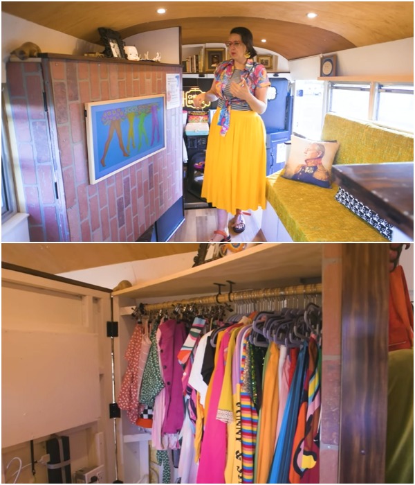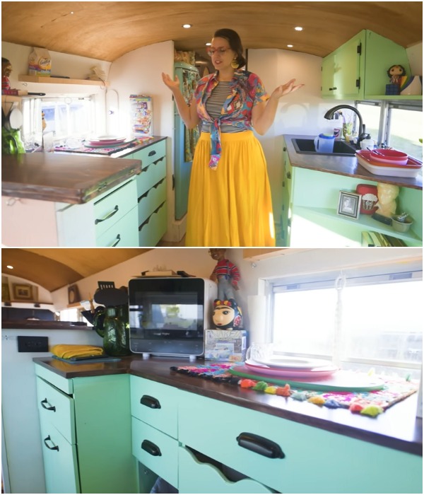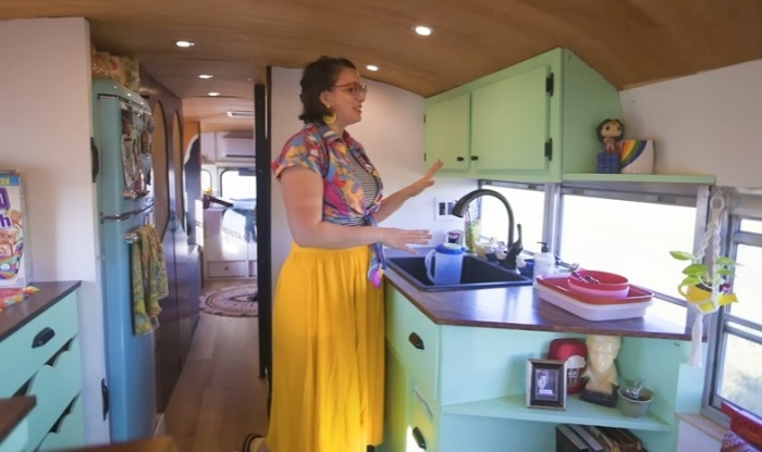 Особенности: Прежде чем приступить к работе ей пришлось приобрести необходимые инструменты, а затем лишь материалы. Также Дестини нужно было хорошенько поломать голову над тем как утеплить и максимально шумоизолировать металлическую оболочку автобуса, чтобы не уменьшилась высота потолков, поскольку девушка довольно высокого роста, а передвигаться на согнутых коленях в собственном доме – совсем не вариант. При этом потребовалось было наращивать высоту напольных тумб, чтобы удобно было готовить, кушать или изготавливать декор, которым украшает дом и свою одежду. С другой стороны, антропологические особенности девушки позволили спокойно устанавливать шкафы от пола до потолка, не думая о том, как добраться до вещей на верхних полках.