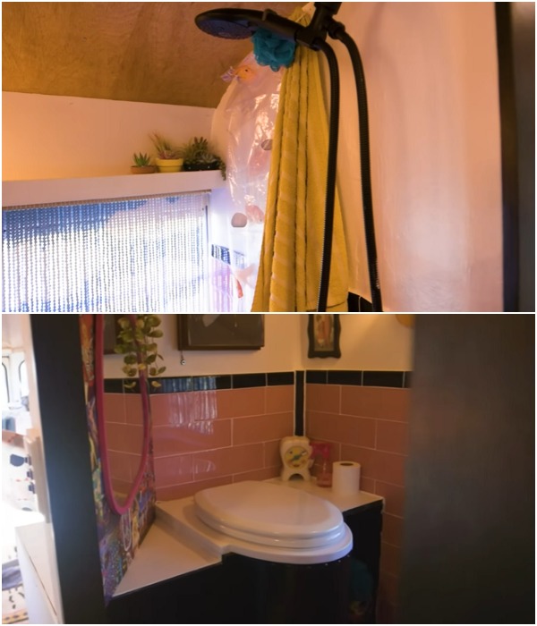 В автобусе нашлось место и для санузла, где находится экономичный душ и туалет на высоком подиуме, поскольку в этом месте находится колесная шина по-другому установить биотуалет было невозможно. Как шутит креативная хозяйка, теперь она имеет собственный трон и, «восседая» на нем, чувствует себя царственной особой, что ей очень нравится.