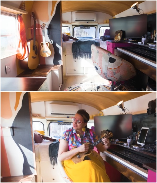 Особо внимательно девушка подошла к размещению и обустройству своей крошечной студии звукозаписи, которая находится возле спальни. Здесь она установила узкие столы для инструментов и оборудования, задействовала и вертикальные площади, где можно повесить гитару и «младшую ее сестру» укулеле (гавайская гитара). Все музыкальные инструменты хоть и зафиксированы, но они съемные, чтобы Дестини могла их брать с собой на выступления (включая электропиано).