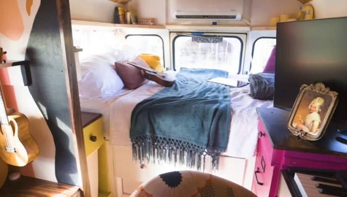 Спальня же находится в задней части автобуса, что делает ее более светлой и просторной за счет обилия окон. Чтобы организовать зону сна, Дестини забрала со съемной квартиры свой ортопедический матрас. Мало того, что ей удалось сэкономить, так теперь у девушки имеется ее любимая кровать, к которой она привыкла, да и размер позволяет максимально расслабиться и полноценно отдохнуть после длительной поездки или концерта.