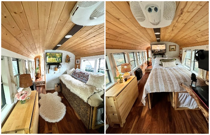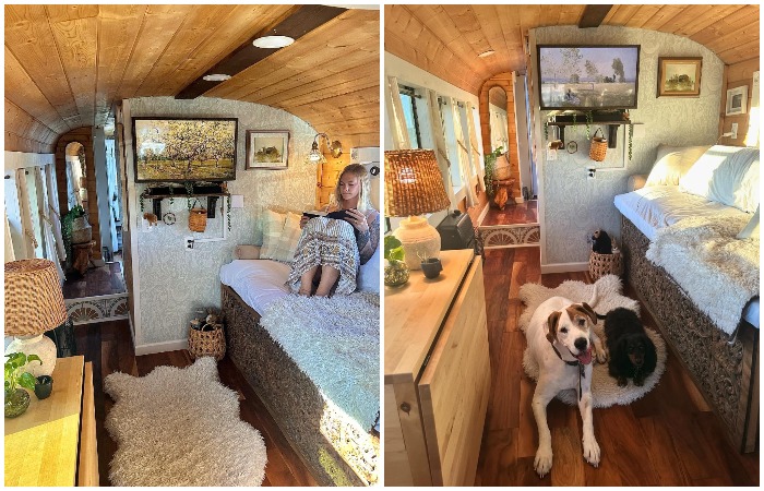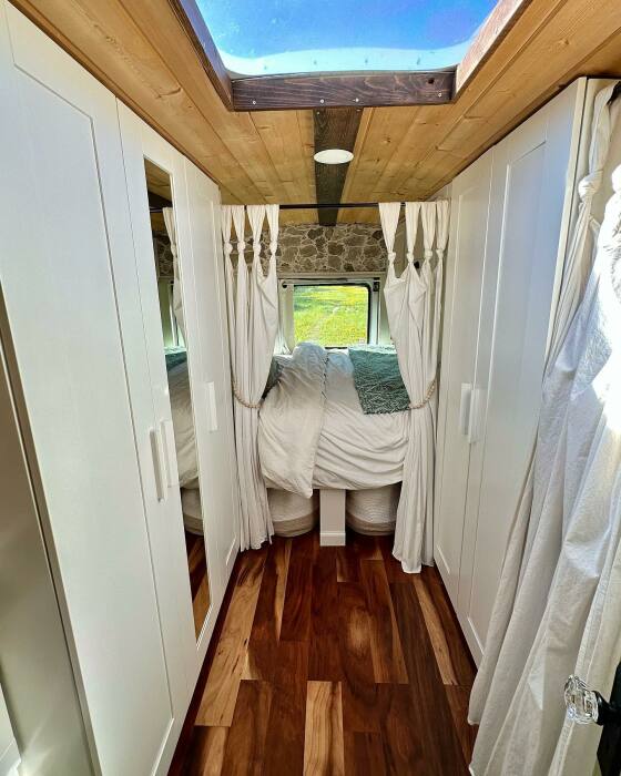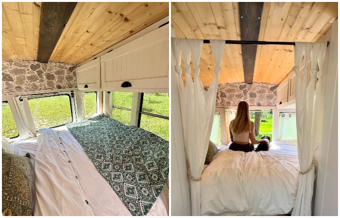 Спальня оказалось самой светлой зоной в мобильном доме, поскольку супруги решили не закрывать окна, а как раз наоборот, они стали главным акцентом, позволяющим любоваться окружением во время отдыха/жизни в природных зонах. При надобности или, когда хочется выспаться, их можно закрыть плотными шторами, так что приватность всегда можно организовать, особенно, если остановились в людном месте.