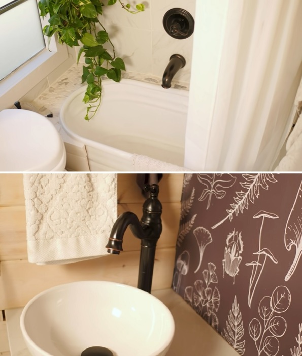 Неожиданной оказалась планировка ванной комнаты, которую приподняли на подиум, чтобы вместить емкость для воды, подаваемую как в душевую, так и на кухню. Сама же ванная хоть и совсем крошечная, да и сильно «крыльями» не помашешь, но все же в ней есть все необходимое для гигиенических процедур и, конечно же, биотуалет, поскольку молодые люди все-таки предпочитают кочевой образ жизни.