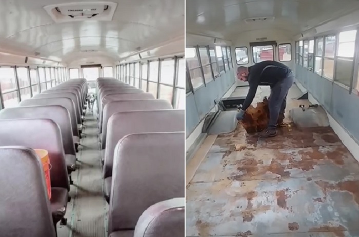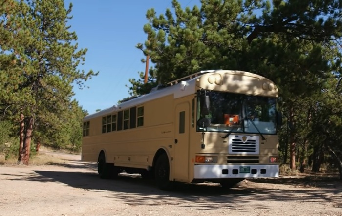 Фасад старого школьного автобуса обрел песочный цвет. | Фото: youtube.com.