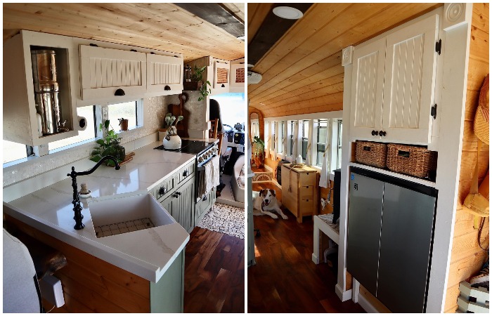 Если говорить о планировке мобильного дома, то за кабиной начинается вполне благоустроенная кухонная зона с оригинальным угловым гарнитуром, который является основной рабочей зоной и системой хранения. Цельную столешницу с квадратной мойкой как раз на углу, прерывает лишь полноразмерная плита с духовым шкафом, что очень удобно для тех, кто привык к домашней пище. А вот холодильник и мини-кладовая установлены напротив основной кухонной зоны, что облегчает труд хозяйки, которая любит побаловать кулинарными изысками. Но все же главной гордостью супругов является дровяная печь, которая находится рядом с кухонной зоной.