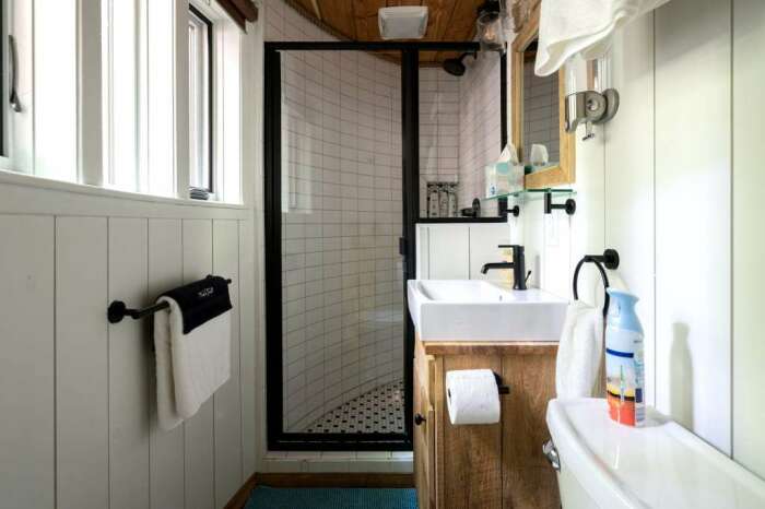Благоустроенная ванная комната (The Hemlock, Хокинг-Хиллз). | Фото: hockinghillstreehousecabins.com.