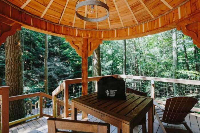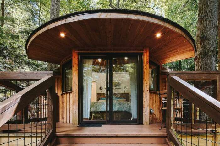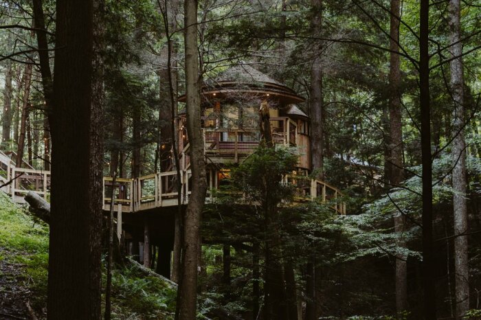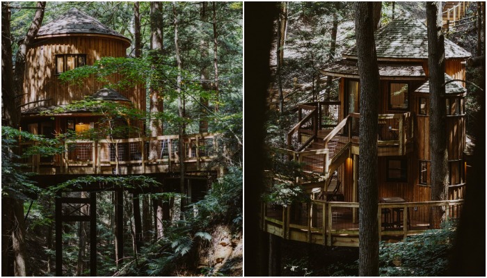 Добраться к домику на дереве можно лишь по мостику, проходящему между деревьев (The Hemlock, США). | Фото: hockinghillstreehousecabins.com.