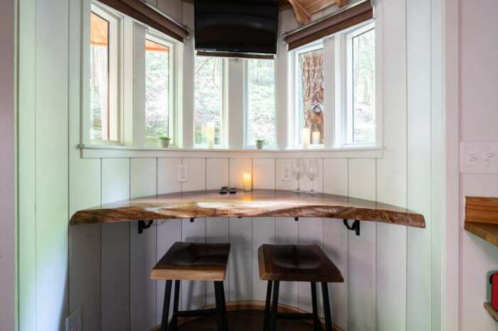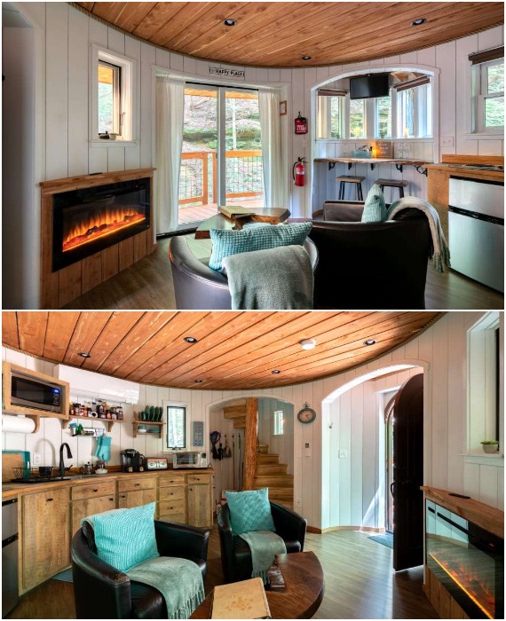 Приближаясь к домику на дереве, больше напоминающему круглую башню в средневековом замке, пусть и сделанную сугубо из дерева, можно разглядеть массивную арочную дверь, соответствующую образу, конусообразные крыши и окружающую его террасу. Сам же отельный номер представляет собой двухэтажный комплекс, хоть и скромных размеров, но довольно комфортабельный. Прямо с порога гостей The Hemlock встречает благоустроенная кухня с полноценным мебельным гарнитуром, необходимой техникой и принадлежностями. Рядышком находится гостиная с двумя дизайнерскими диванами и оригинальным столиком. Обеденная же зона расположена в эркере возле большого окна, что позволит проводить романтические вечера в прекрасном окружении.
