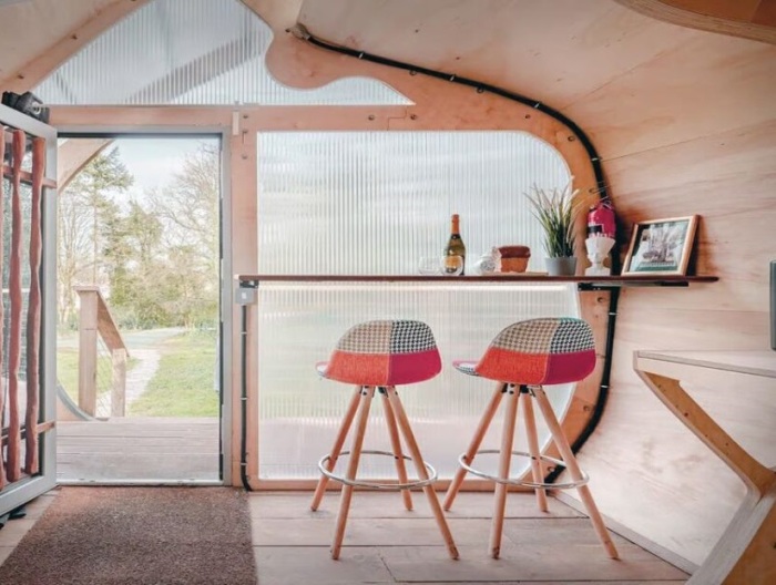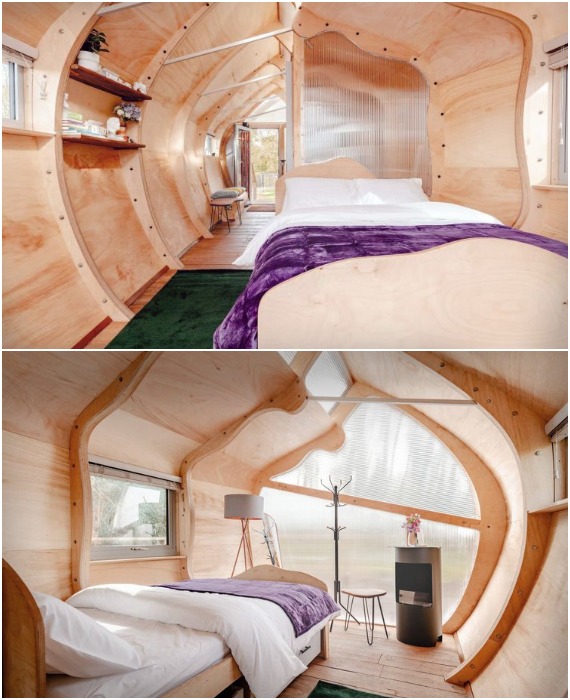 В задней части модульного домика предусмотрена довольно просторная и очень светлая спальня, где установлена кровать размера «queen-size», несколько открытых полок на изогнутой стене и дровяной или газовый камин. Структурированное стекло из толстого поликарбоната пропускает достаточно много света, при этом преломляет солнечные лучи, чтобы не перегревалось крошечное пространство, а его матовая поверхность обеспечивает приватную обстановку для владельцев или отдыхающих.