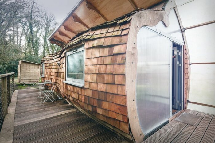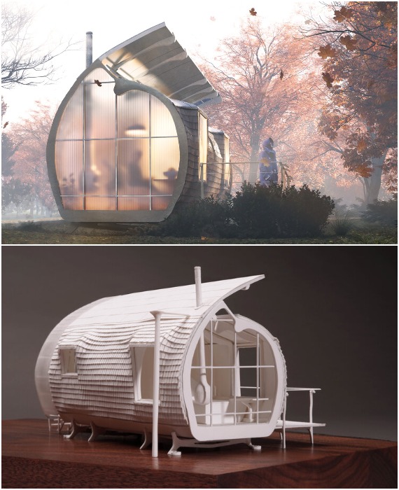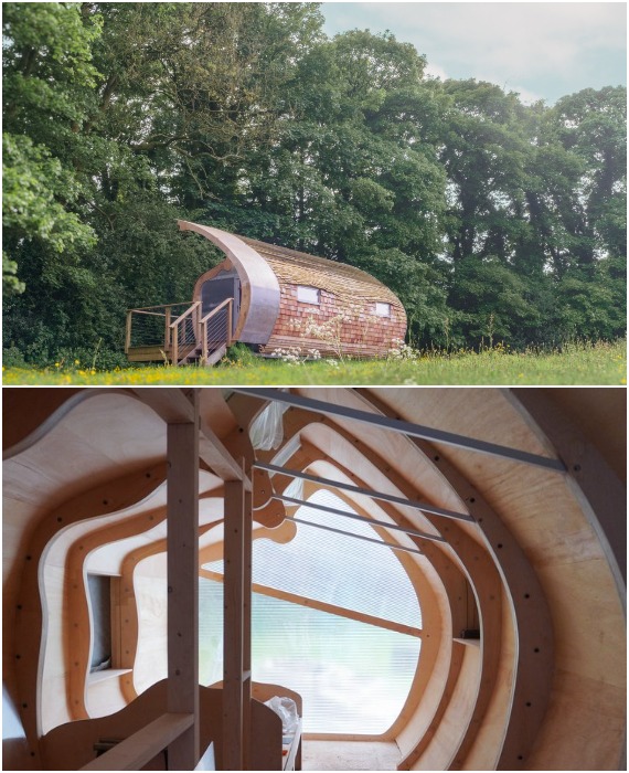 Изогнутая форма и структура крошечного дома для большинства современников скорее ассоциируется с коконом или улиткой, но это никак не отражается на его универсальности и уникальности. И пусть причудливый образ не вводит в заблуждение потенциальных владельцев оригинального домика, который легко может стать как дачным вариантом, так и отельным номером, ведь он наделен неоспоримыми достоинствами, способными заинтересовать даже самых привередливых любителей отдыха на природе.