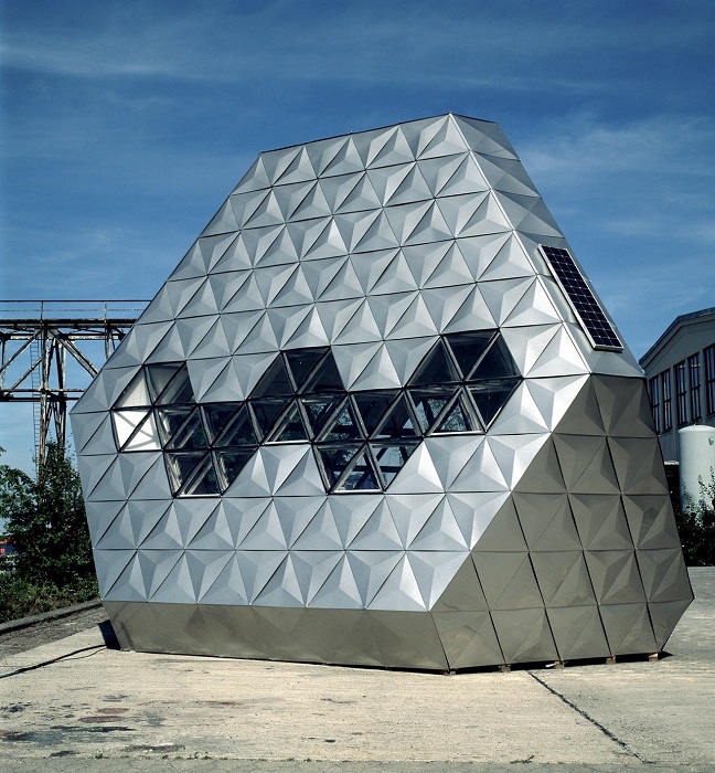 В Копенгагене, в парке скульптур Kunsthal Aarhus появилось удивительное творение под названием Spaceframe Complex, глядя на которое можно усомниться, действительно ли мы находимся земле. Замысловатая конструкция с призматическими формами, изготовленная из алюминия, стали и стекла выглядит как дом будущего в Галактике, а не как здание, в привычной городской среде. Хотя «космическая капсула», разработанная коллективом энтузиастов своего дела, одинаково интересно выглядит не только в городе, ее легко можно установить на плавучую платформу, среди лесной поляны или даже на крыше многоэтажных зданий