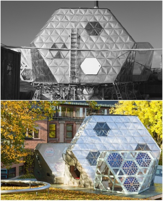 Примечательно: Идея «космической» структуры заключалась в том, чтобы сделать максимально просторное жилище при минимальных затратах материала, времени и финансов. Базовая структура представляет собой ромбовидную форму, которая дает возможность создавать всевозможные геометрические фигуры, соединяя друг с другом для расширения пространства. Также такой подход позволяет размещать домик как на суше, так и на воде, предварительно закрепив на плавучую платформу. Чтобы облегчить конструкцию дома без ущерба для безопасности и эстетики, основными материалами стали алюминий и сталь. Использование правильного утеплителя позволило уменьшить не только теплопотери, это поспособствовало увеличению внутреннего пространства.