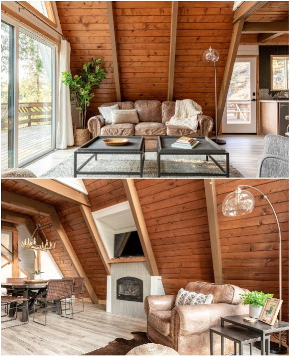 Прямоугольная вставка в А-образную структуру Acorn Falls позволила обустроить традиционные комнаты. | Фото: lifetinyhouse.com.