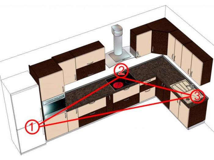 Важными компонентами любой кухни являются холодильник, мойка и варочная поверхность, которые должны быть организованы так, чтобы создавать эффективный рабочий треугольник. В кухнях с П-образной и Г-образной планировкой такая организация пространства достигается без труда. В случае же с прямыми кухнями, компактный обеденный стол может служить третьим углом треугольника, выполняя роль дополнительной рабочей зоны.