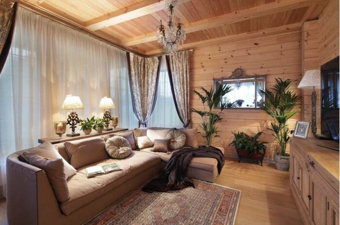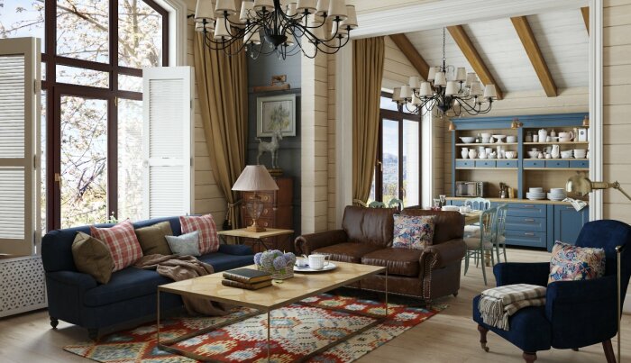 Стиль кантри — привносит в интерьер ощущение тепла и домашнего уюта, благодаря элементам таким как живой огонь в камине, ничем не скрытые деревянные балки или стропила, которые служат украшением потолка. Яркие текстильные акценты, такие как скатерти и шторы, добавляют колорит и подчеркивают индивидуальность пространства.