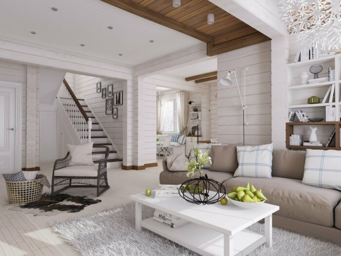Скандинавский стиль — отличается использованием натурального дерева в мебели и отделке, создавая светлый и воздушный интерьер. Простота и функциональность мебели, белоснежные стены и потолок, дополненные несколькими цветными акцентами и современными осветительными приборами, характеризуют этот стиль.