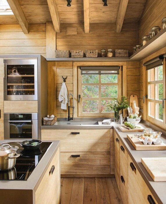 На кухнях с ограниченным пространством рекомендуется использовать многоярусные полки и шкафы для оптимального использования места. Важно следить за тем, чтобы не перегружать их крупногабаритными предметами, например, большими кастрюлями или сковородами. Лучше всего размещать такие предметы на верхних подвесных полках, где также удобно хранить бытовую химию, салфетки и различные специи.