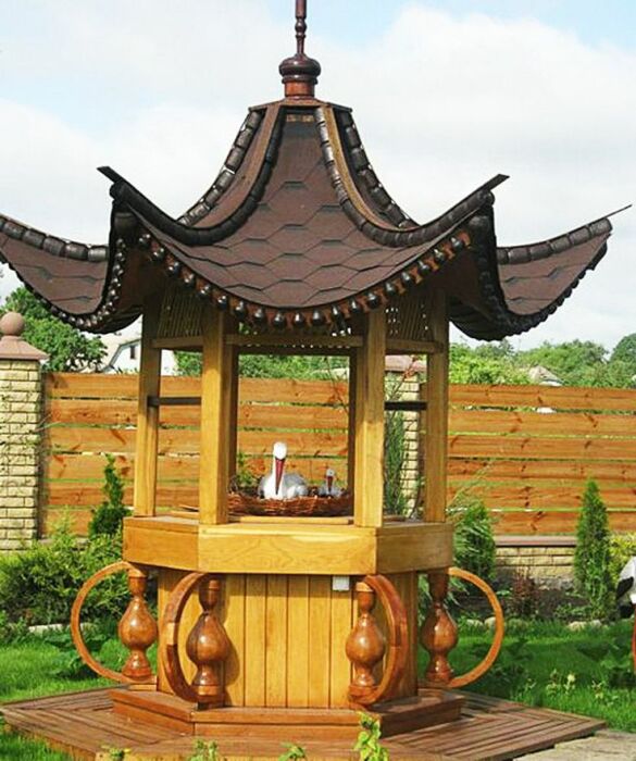 Дерево добавит уникальный шарм и природная красота для конструкции колодца. Изготовленные из бруса, бревен или досок, они могут быть украшены резными элементами, делая колодец не только декоративным, но и функциональным, защищая воду от загрязнений.