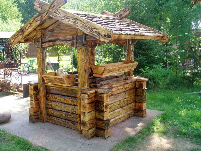 Одним из главных преимуществ деревянных колодцев является возможность создания квадратного каркаса вместо облицовки цилиндрической поверхности, что облегчает процесс строительства. Дерево легко поддается обработке, давая возможность владельцам делать отделку самостоятельно.