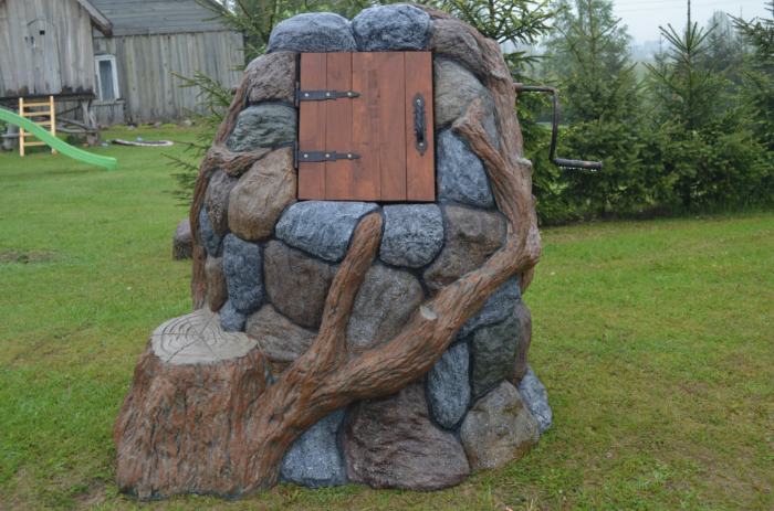 Камень для отделки вокруг основания колодца выглядит великолепно и привлекательно. Он обладает универсальностью и может быть использован как в классическом загородном стиле, так и в романтической обстановке на даче. Для этого подойдут как натуральные породы, такие как песчаник или галька, так и искусственные материалы. Камень можно укладывать с помощью специального клея или цементного раствора. Также можно украсить конструкцию тропинкой из того же материала.
