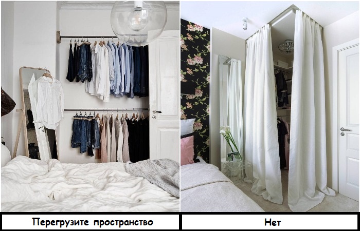 В попытке вместить в спальню все и даже больше, мы забываем о рациональном использовании пространства. В итоге к кровати можно пробраться только боком, а дверцы шкафа открываются в лучшем случае наполовину. Как минимум, такая картинка смотрится визуально перегруженной, а как максимум – комната становится абсолютно нефункциональной.