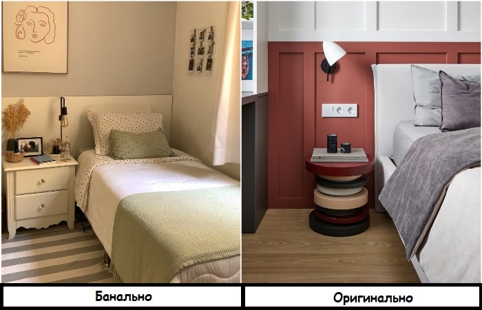 • Ничего не меняйте. Если вам нужно куда-то положить мелкие вещи, повесьте небольшую полку – она займет минимум места, и будет смотреться не так громоздко, как тумба. Вместо настольной лампы можно повесить бра в изголовье. • Установите торшер. Он идеально займет угол, заполнив пустоту, подарит мягкий, теплый, приглушенный свет. Также торшер переключит внимание с кровати на себя. • Поставьте маленький столик, вроде кофейного. Такое решение выглядит более элегантно, но при этом не менее функционально, чем стандартная тумба. • Займите угол высоким шкафом. Этот прием идеально подойдет в том случае, если в спальне не хватает мест для хранения. Тогда площадь необходимо использовать по максимуму. • Разместите мягкий удобный пуф. При необходимости его можно будет перенести в любую часть комнаты и даже квартиры, а когда он будет находиться на своем месте, будет выглядеть тепло и уютно.