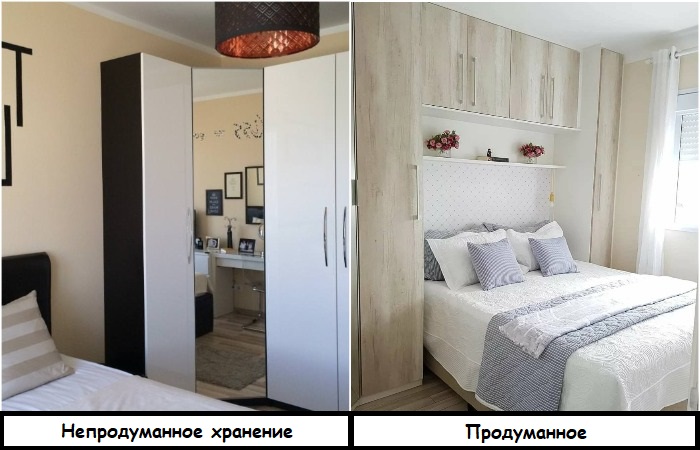 Чтобы не лишать спальню удобства, подумайте, куда можно вынести основную зону хранения. Возможно, есть возможность поставить большой шкаф на всю стену в прихожей или организовать гардеробную. Также не списывайте со счетов балкон – как показывает практика, если привести его в порядок и утеплить, здесь можно хранить большое количество вещей.