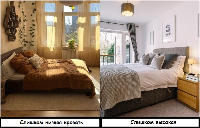 Если вы подбираете для своей спальни кровать нестандартной высоты, необходимо учесть ряд моментов. Так, например, слишком низкая мебель создает психологический дискомфорт, особенно если вокруг стоит большой шкаф, громоздкий комод и пр. Вокруг такой кровати должно быть много света и воздуха. А вот высокое спальное место требует, чтобы пространство под ним не пустовало, поэтому рекомендуем организовать там хранение с помощью красивых ящиков или плетеных корзин.