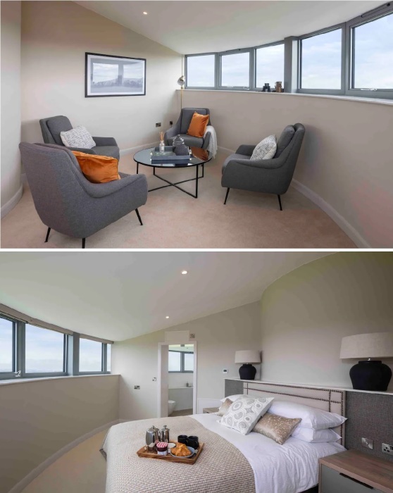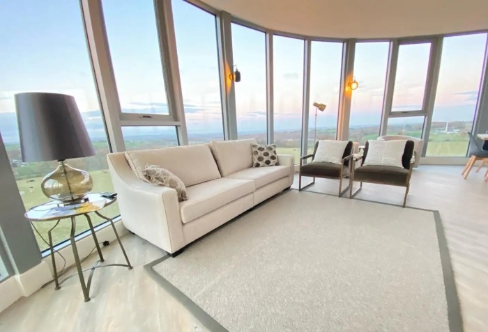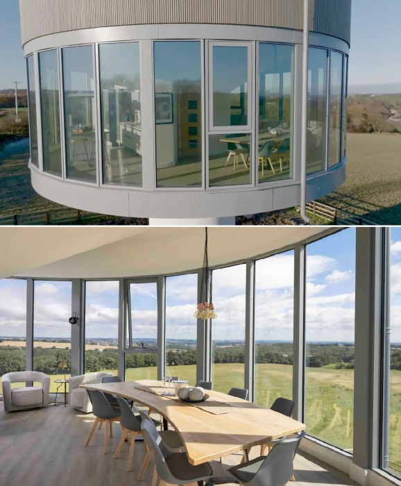 Зона гостиной с фантастическими видами за окном (Flockton Water Tower, Англия). | Фото: celebrationcottages.co.uk.