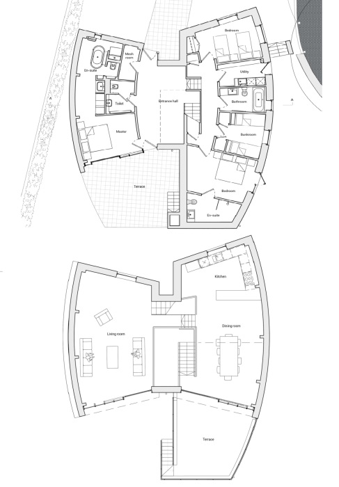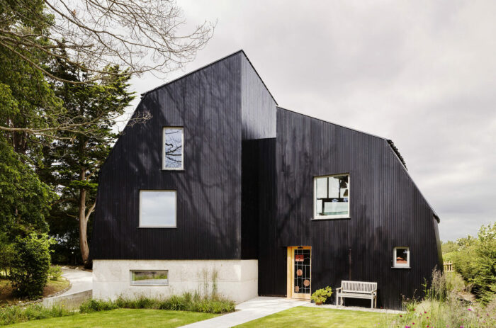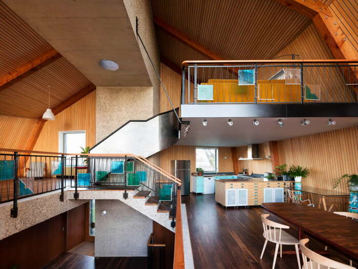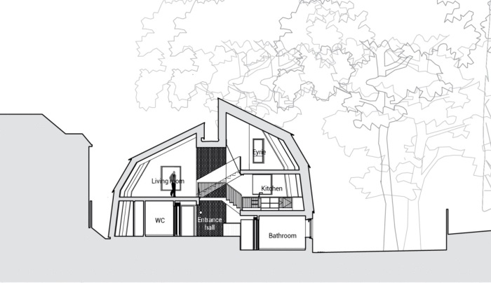 Дом спроектирован как две половины корпуса перевернутой лодки, которая должна была стать идеальным укрытием для большой семьи или гостевым домом. Одна часть «баркаса» расположена чуть выше, следуя за ступенчатым участком, из-за чего дом получился разноуровневым и разделенным пополам. А вот двойной изгиб в структуре здания, спроектирован не только для того, чтобы быть похожим на морское судно, благодаря ему получилось создать более объемное и интригующее строение, выбивающееся из типичной застройки улицы, на которой оно расположено.