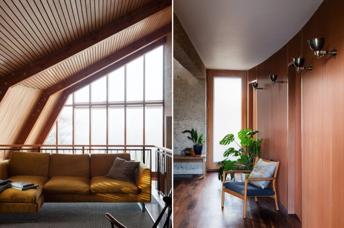 Если говорить об отделке внутреннего пространства, то здесь использовались: необработанный бетон, древесина, энкаустическая плитка (запеченная при высоких температурах цветная глина) и сталь. Из-за обилия деревянных панелей на стенах и потолке, внутреннее пространство кажется окутанным деревом, что помогает поддерживать теплую и уютную атмосферу, дополненную более чем приятными тактильными ощущениями. Дерево заодно смягчает брутальность необработанного бетона, который можно увидеть на несущих конструкциях и лестничном марше.