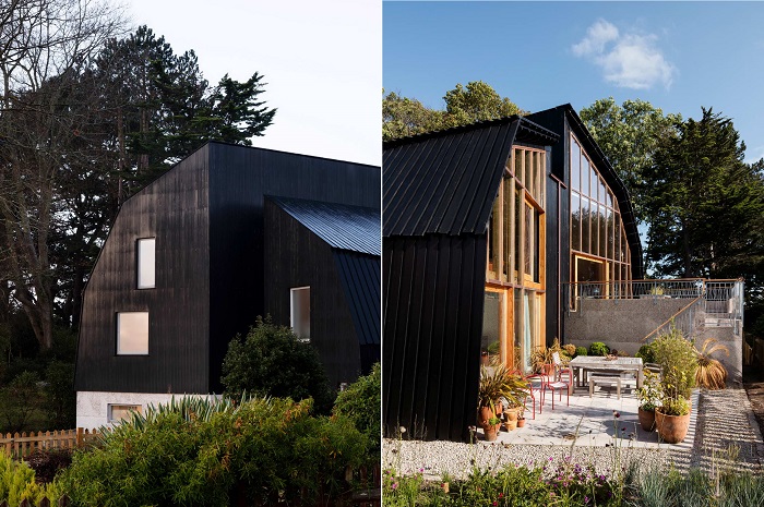 Стоит отметить, что процесс строительства значительно затянулся, поскольку требовалась грамотная интеграция в участок на побережье, щедро покрытый вековыми соснами. Это обстоятельство повлияло и на форму здания, и на выбор структуры фундамента, который не должен был повредить корни растений. Пришлось аккуратно укреплять склон и заливать бетонную площадку, которая стала своеобразной авансценой, выступающей в качестве центрального структурного стержня дома. Ее оказалось достаточно для установки и закрепления деревянного каркаса, образующего основную конструкцию стен и крыши, покрытых характерным «панцирем» черного цвета.