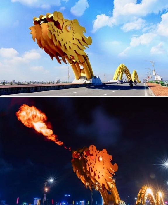 Каждый день в 9 часов вечера из пасти дракона вылетает струя пламени (Dragon bridge, Вьетнам).