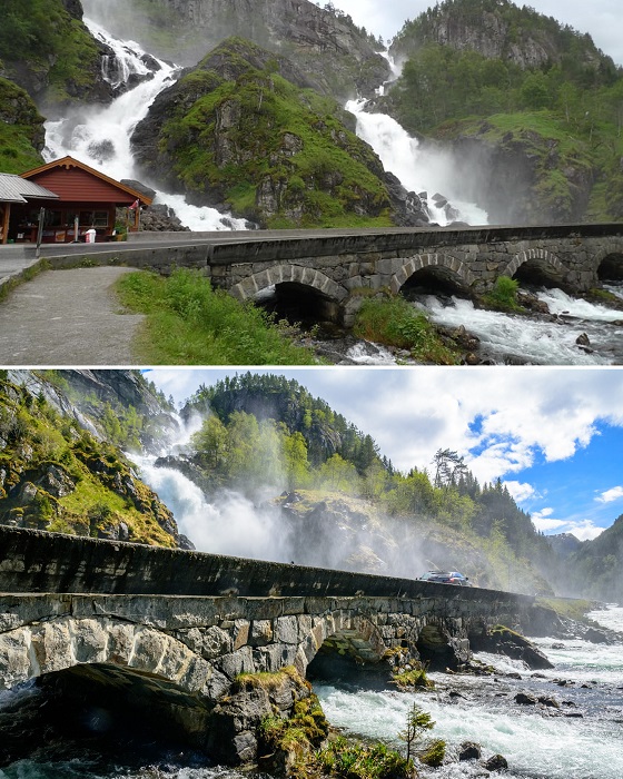 С арочного моста можно увидеть во всей красе два потока воды Лотефоссена (Норвегия). | Фото: kuku.travel.