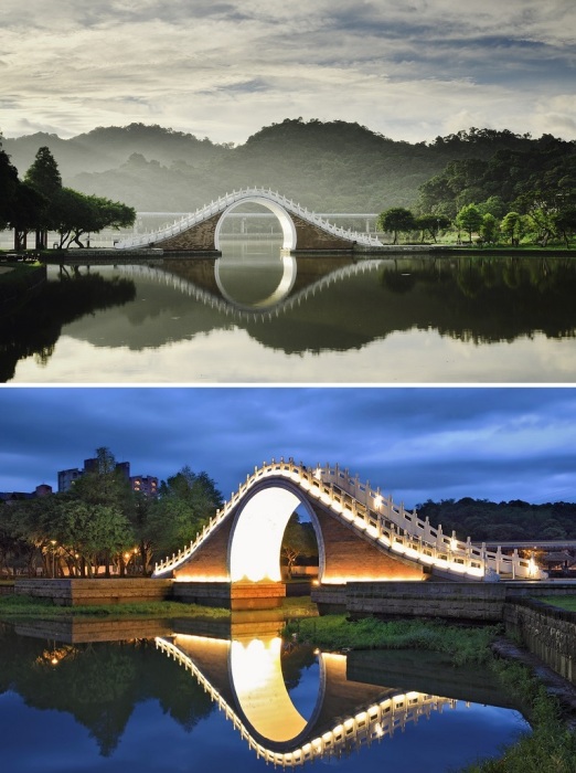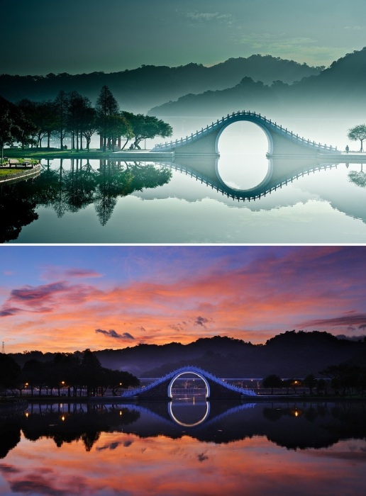 Если смотреть на отражение моста в спокойной воде, то тень вместе со структурой моста образуют идеальный круг (Тайбэй, Тайвань).